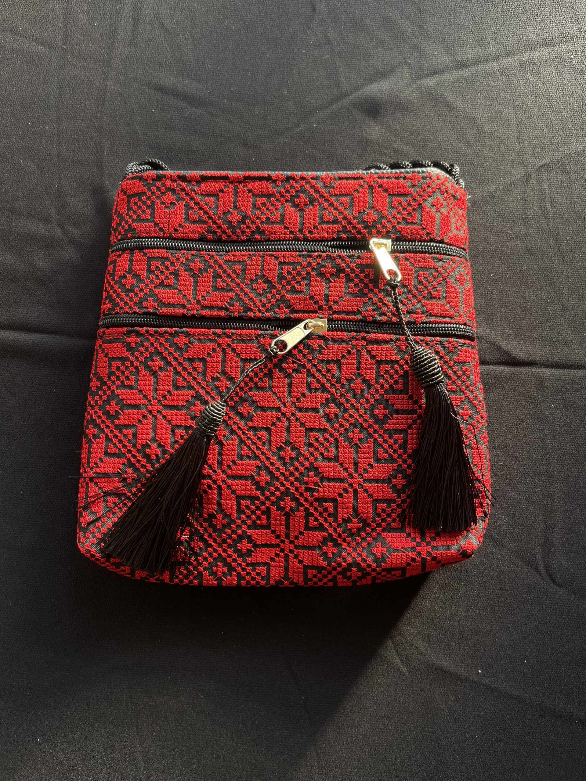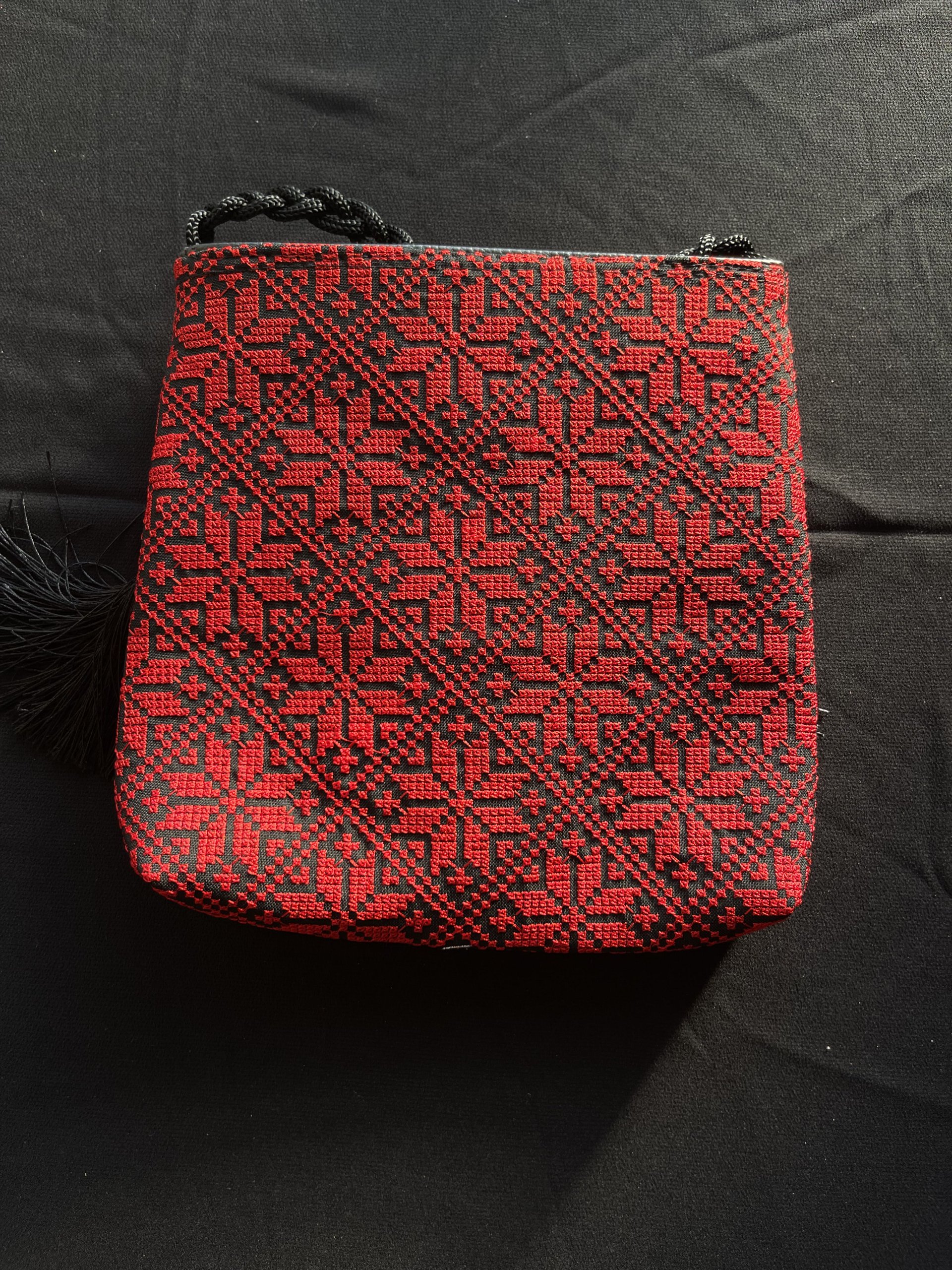 شنطة قماش تطريز ماكنة فلسطيني، نقشة نجمة، باللون الأحمرالسادة، مبطن بقماش أسود، دفتين أماميات بسحاب مع شرشوبة، وقشاط جدلة.