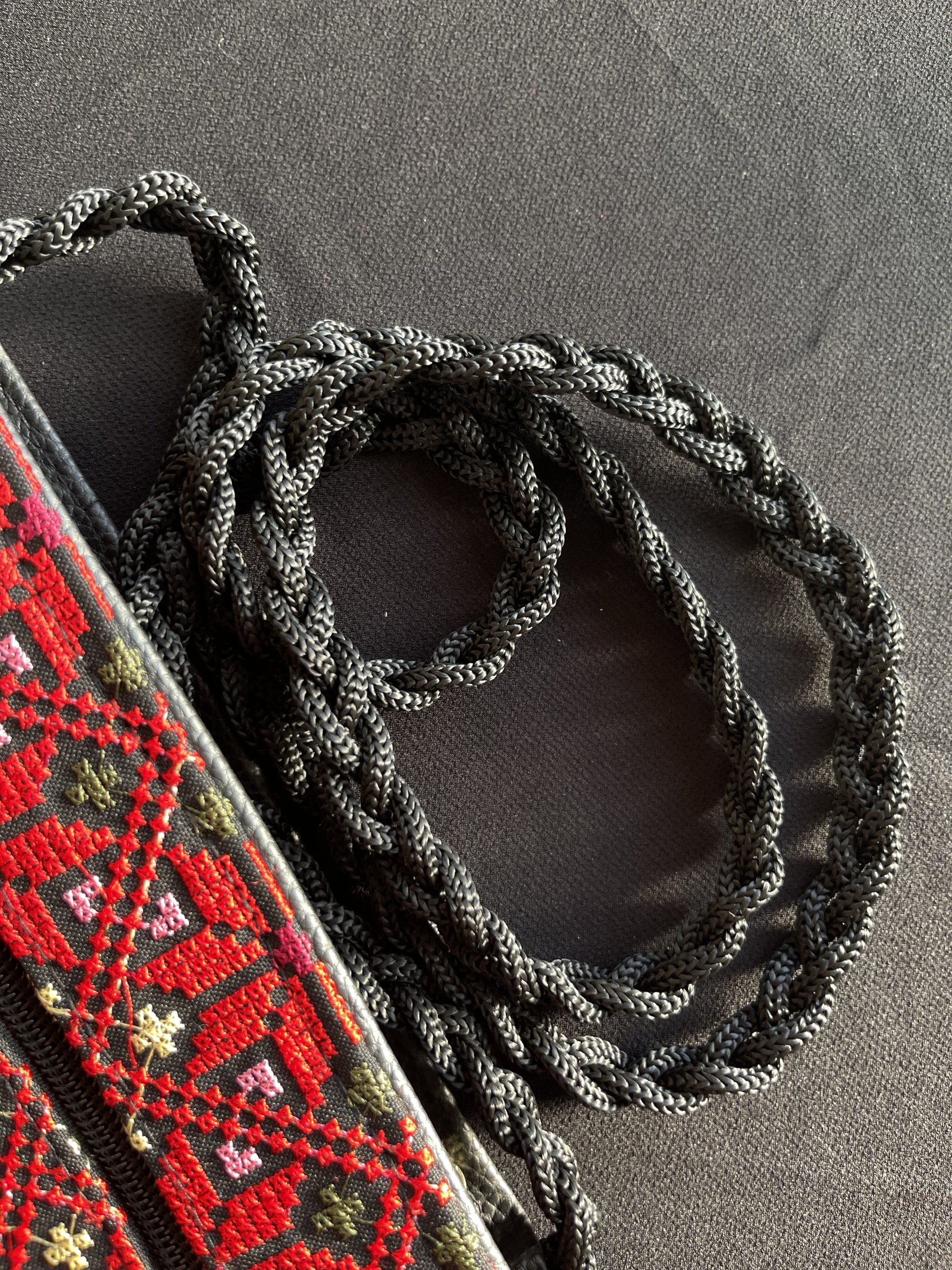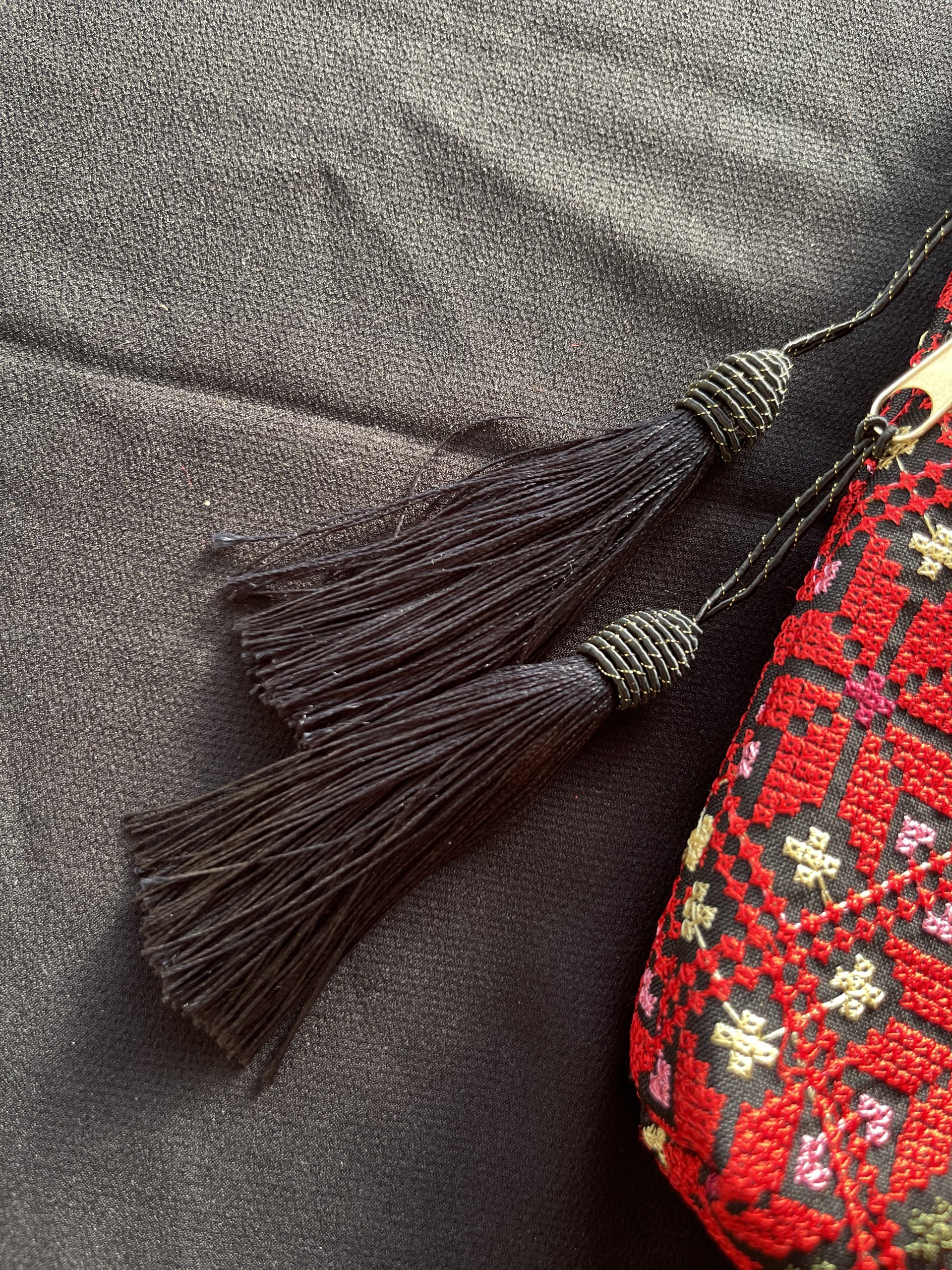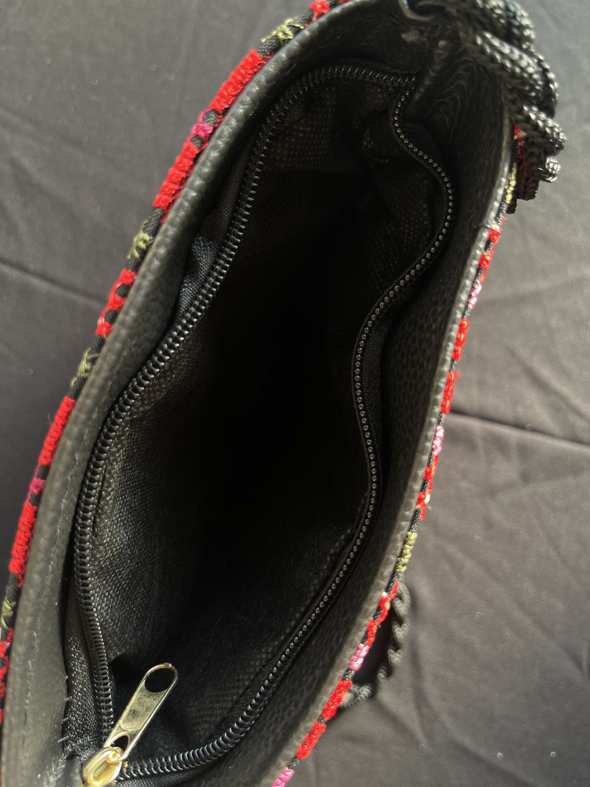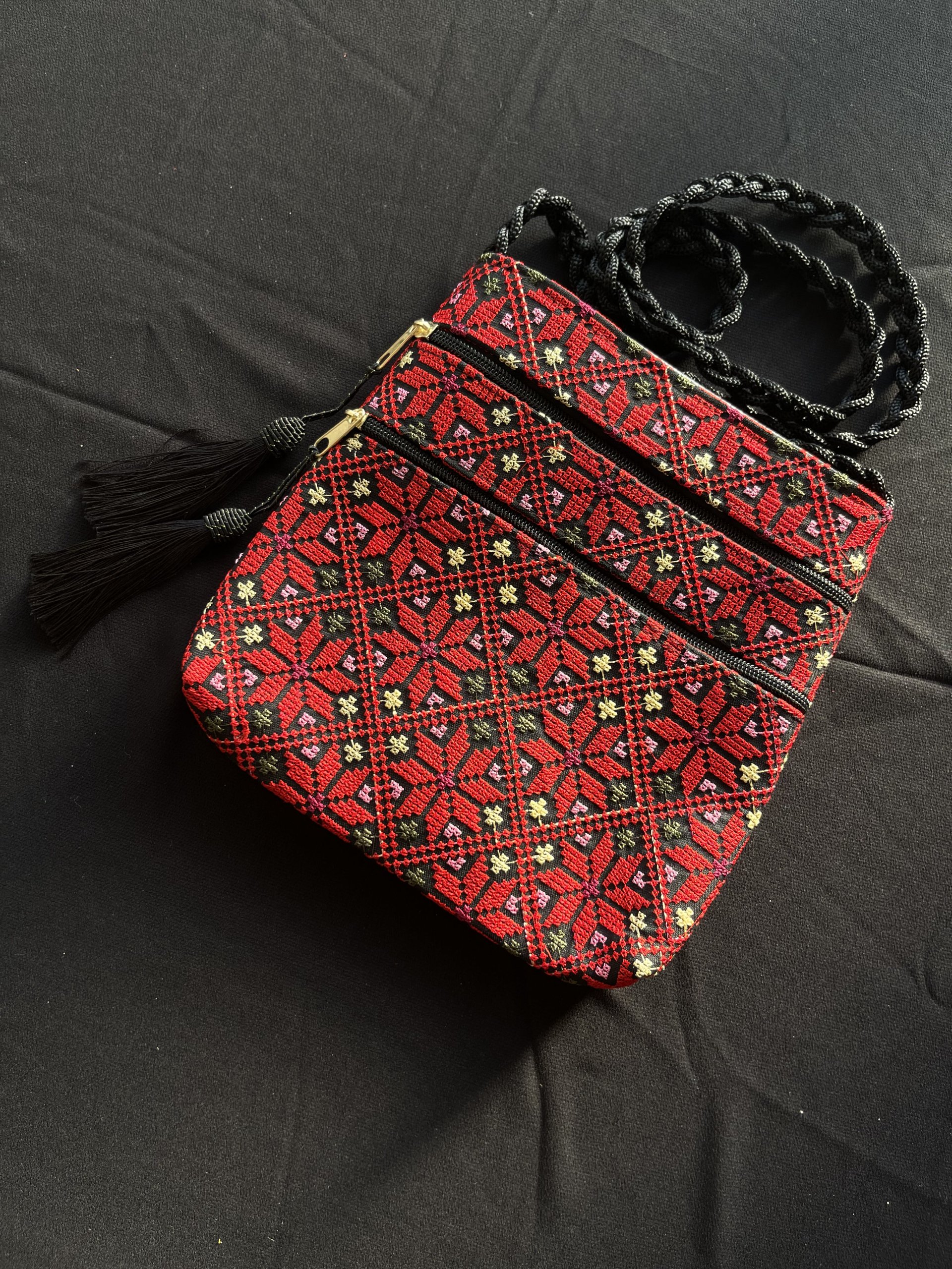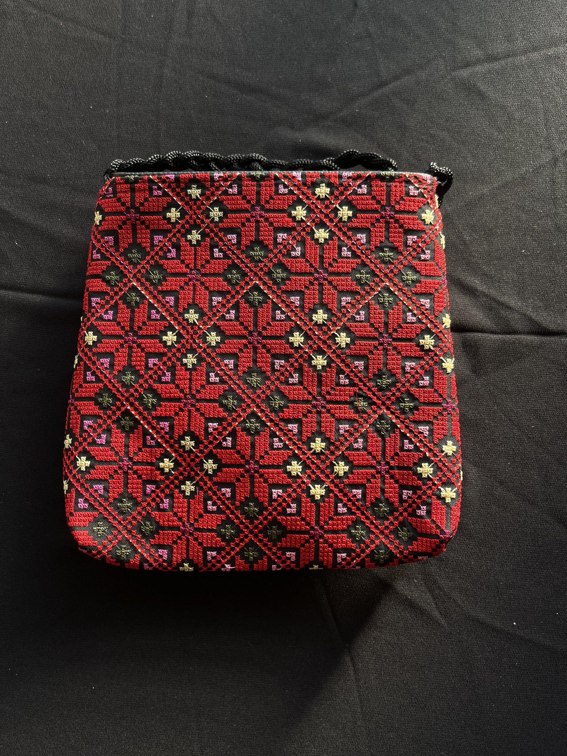 شنطة قماش تطريز ماكنة فلسطيني، نقشة نجمة، باللون الأحمر مع الأصفر والأخضر، مبطن بقماش أسود، دفتين أماميات بسحاب مع شرشوبة، وقشاط جدلة.