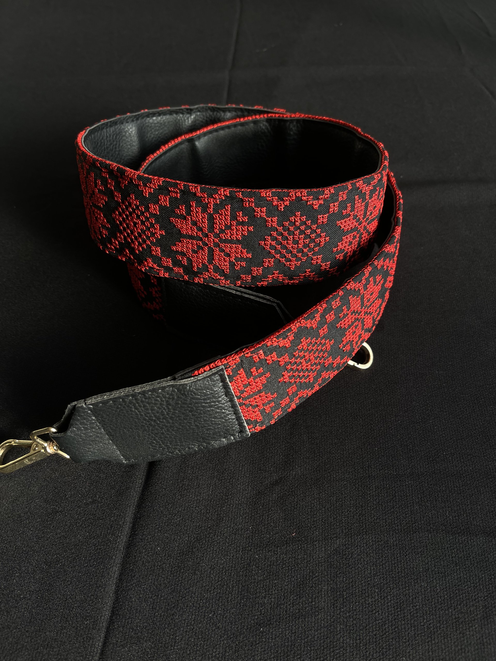قشاط للشنط تطريز ماكنة فلسطيني، باللون الأحمر السادة. مبطن بالجلد الأسود.