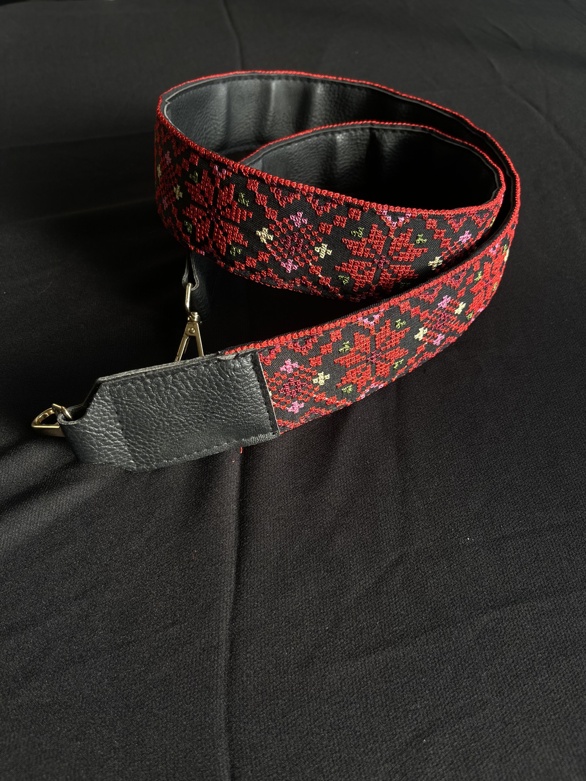 قشاط للشنط تطريز ماكنة فلسطيني، باللون الأحمر مع الأصفر والأخضر والوردي. مبطن بالجلد الأسود.