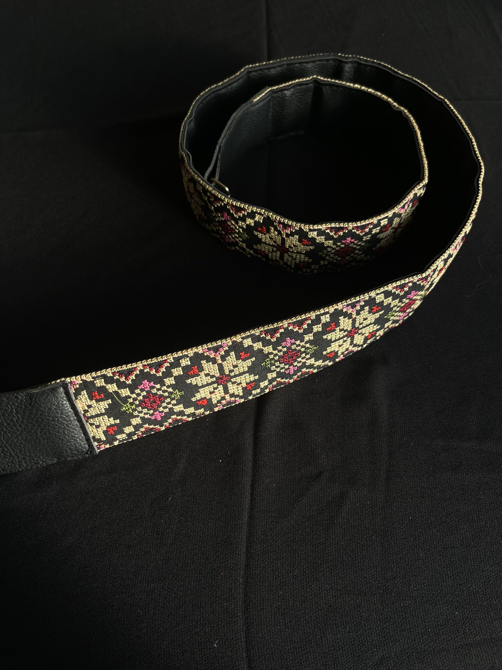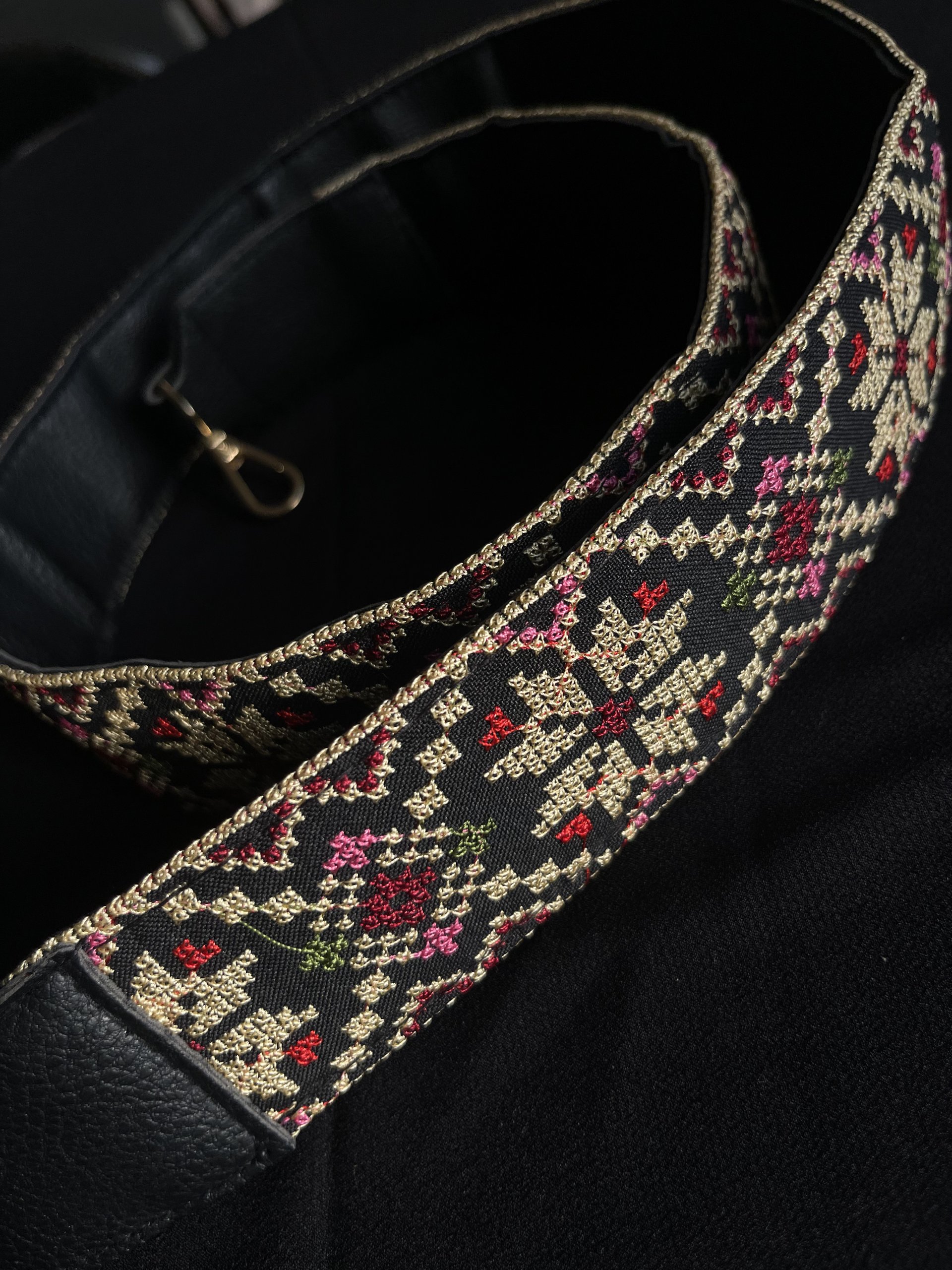 قشاط للشنط تطريز ماكنة فلسطيني، نقشة نجمة، باللون الأسود مع البيج والأحمر والوردي والأخضر. مبطن بالجلد الأسود.